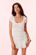 Sunshine ready in the Elisavette Dress. This charming mini debuts with our best-selling pointelle yarn with a nice stretch and extra soft feel. The dress has stripes throughout with lurex giving this piece our signature shimmer. Beginning with short cap sleeves, the piece has a scoop neckline, scallop details, and a fit-and-flare silhouette.